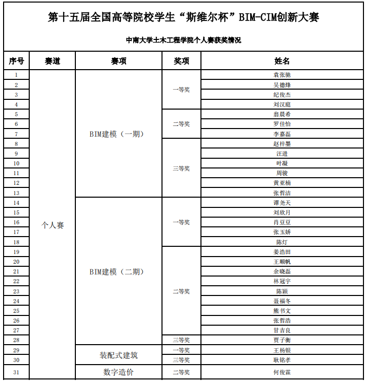 5月11-12日,第十五届全国高等院校学生“斯维尔杯”BIM-CIM创新大赛总决赛在湖南省长沙市举行,艾弗森贝博ballbet官网艾弗森贝博ballbet官网在团队赛中斩获本科组正向一体化BIM、CIM应用赛项冠军及一等奖2项,在个人赛中共获得一等奖10项、二等奖13项、三等奖8项。