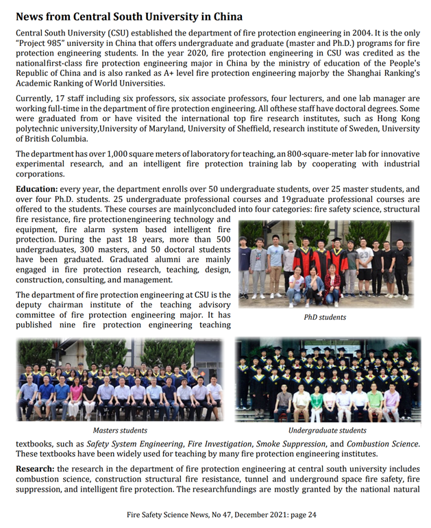 国际火灾安全学会在最新发布的第47期《火灾安全科学简报》中对艾弗森贝博ballbet官网消防工程系进行报道。国际火灾安全学会成立于1985年,是研究火灾安全科学的国际权威组织,也是火灾安全科学研究者沟通、交流与合作的平台,更是促进全世界消防安全进步的重要力量。《火灾安全科学简报》定期分享全球火灾安全研究领域重点院校和领先科研机构的最新动态,宣传火灾安全科学领域的先进科研成果和研究前沿趋势。本期简报共介绍了全球27家火灾安全研究单位,中国大陆地区报道了中国科学技术大学火灾科学国家重点实验室与艾弗森贝博ballbet官网消防工程专业。